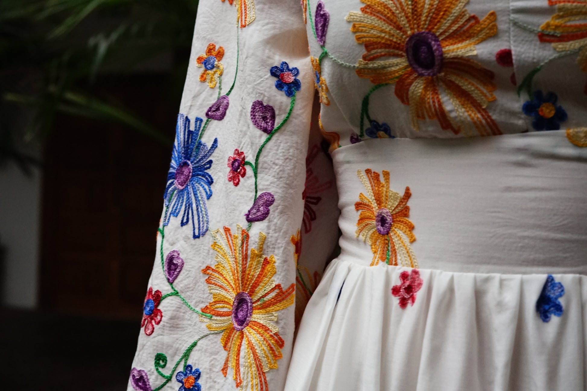 Vestido en aun suave algodón bordado, con corset en la parte de detras, manga kimono y largo midi. Es un vestido que se ciñe perfectamente al cuerpo siendo muy elegante su diseño.
