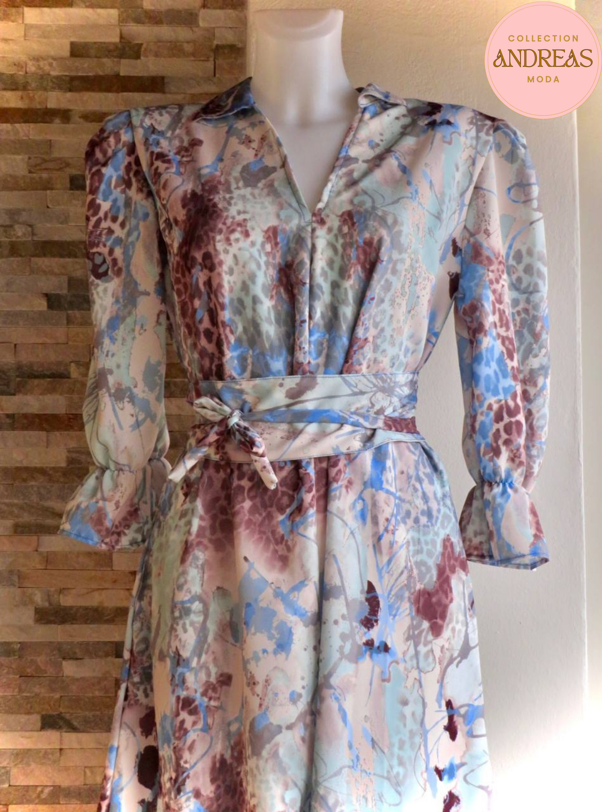 Vestido largo estampado, con manga larga y volante al final, abertura en la falda y cinturon